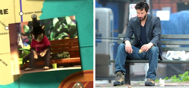 У мультфільмі є момент, коли глядачам показують картку з прикріпленими до неї фотографіями. На висить праворуч знімку зображений сумний вовк, який сидить в парку на лавці і їсть бутерброд. Ця фотографія — недвозначна пародія на популярне в інтернеті фото Кіану Рівза.