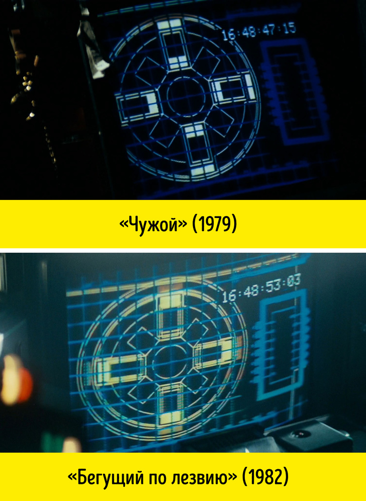 Фанати знають, що кадри з комп'ютерним інтерфейсом з фільму «Чужий» (1975) використовувалися в «Біжить по лезу» (1981). В результаті чого створюється відчуття, що дія обох фільмів розгортається в одній і тій же всесвіту. У фільмі «Чужий: Заповіт» режисер Рідлі Скотт продовжив традицію.