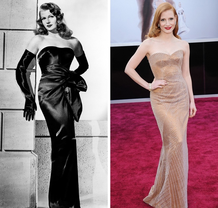 Богиня золотого століття Голлівуду Рита Хейворт і наша сучасниця актриса Джесіка Честейн є ідеальним втіленням голлівудської класики. Як у свій час Рита, Джессіка вибирає вбрання в підлогу, підкреслюють фігуру, з відкритими плечима і хвилясті подолом. Завершують образ діви руді локони, укладені голлівудської хвилею.