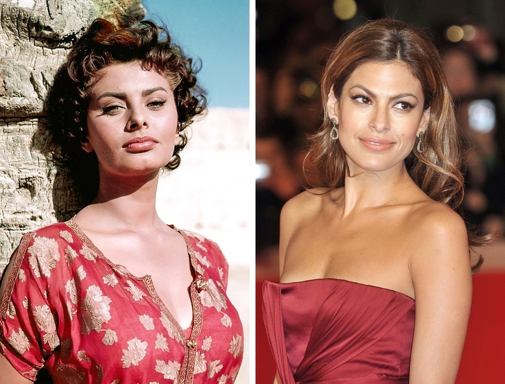 Єву Мендес часто порівнюють з Софі Лорен, що зовсім не дивно, адже актриси володіють схожим типажем: вони обидві пекучі брюнетки з шикарними жіночними формами, які вони підкреслюють відповідними нарядами.