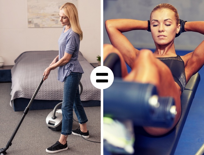 Будь-яку роботу по дому можна зробити більш приємною, якщо пам'ятати, що ручна праця тримає тіло в тонусі. Півгодини звичайного прибирання можуть відняти у вас близько 85 калорій, що приблизно дорівнює 15-хвилинної тренуванні преса. А ось генеральне прибирання за той же час — приблизно в 2 рази більше.