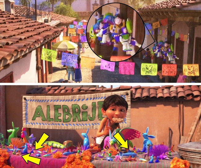 У мультфільмі «Таємниця Коко» є кілька цікавих посилань. Наприклад, на центральній вулиці мексиканського містечка, де живе головний герой, можна помітити великі ляльки — це Базз Лайтер і ковбой Вуді з мультфільму «Історія іграшок».