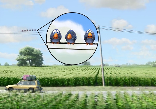 І ось ще один мультик Pixar, в якому уважний глядач знайде масу «привітів» з інших робіт студії. Один з них з'являється на початку мультфільму в сцені, коли Райлі разом зі своїми батьками їде через всю країну в новий будинок. На проводах можна помітити кілька круглих пташок: вони виглядають точнісінько як персонажі короткометражки 2000 року під назвою «Про пташок».