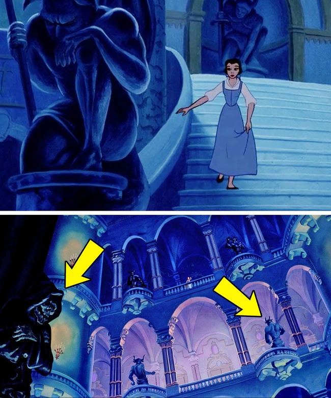 Напевно, всі пам'ятають ті страшні фігури чудовиськ, якими прикрашений замок Чудовиська. Особливо моторошно й похмуро скульптури виглядають на початку мультфільму, коли Белль в страху вивчає замок. Як виявилося, більшість скульптур — це різні ранні версії Чудовиська, які були зроблені художниками в процесі створення його образу.