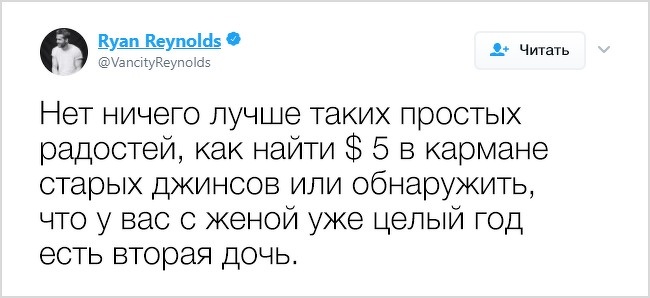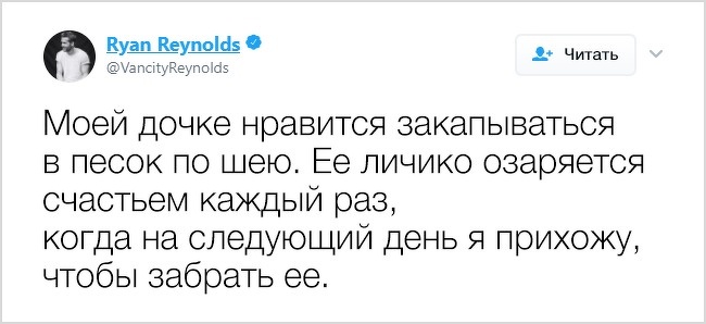 Майже кожен сучасний актор або актриса ведуть активне життя в інтернеті, але лише поодинокі акаунти в соцмережах стають цікавими не тільки шанувальникам кіно, але і просто любителям хорошого почуття гумору. Саме до їх числа відносяться instagram і твіттер чарівного канадського актора Райана Рейнольдса. Зірка тролить абсолютно всіх — дружину, дочок, брата, маму і самого себе. Його гострі жарти розходяться по мережі як гарячі пиріжки. Саме їх ми і пропонуємо вам «розкуштувати» в цій статті. Обережно: начинка «пиріжків» щедро приправлена сарказмом.