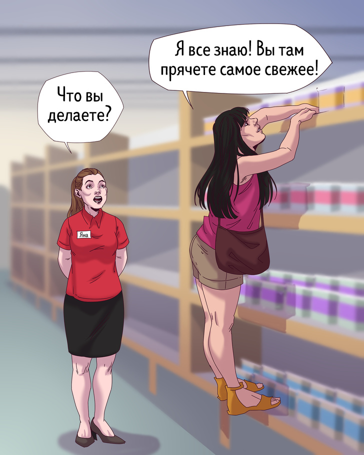 Перший у світі супермаркет був відкритий в Нью-Йорку в 1930 році — засновник і власник Майкл Каллен розташував його в колишньому гаражі і назвав King Kullen. За майже 90 років, що пройшли з того моменту, магазини самообслуговування з'явилися у всіх точках планети, і кожен рік люди залишають у них трильйони доларів. Але, незважаючи на те що всі ми різні, в кожному супермаркеті можна зустріти класичні типажі покупців: наприклад тих, хто в пошуку самих свіжих сосисок намагається дістати до дальньої полиці, або тих, хто не може вибрати з двох практично однакових продуктів.