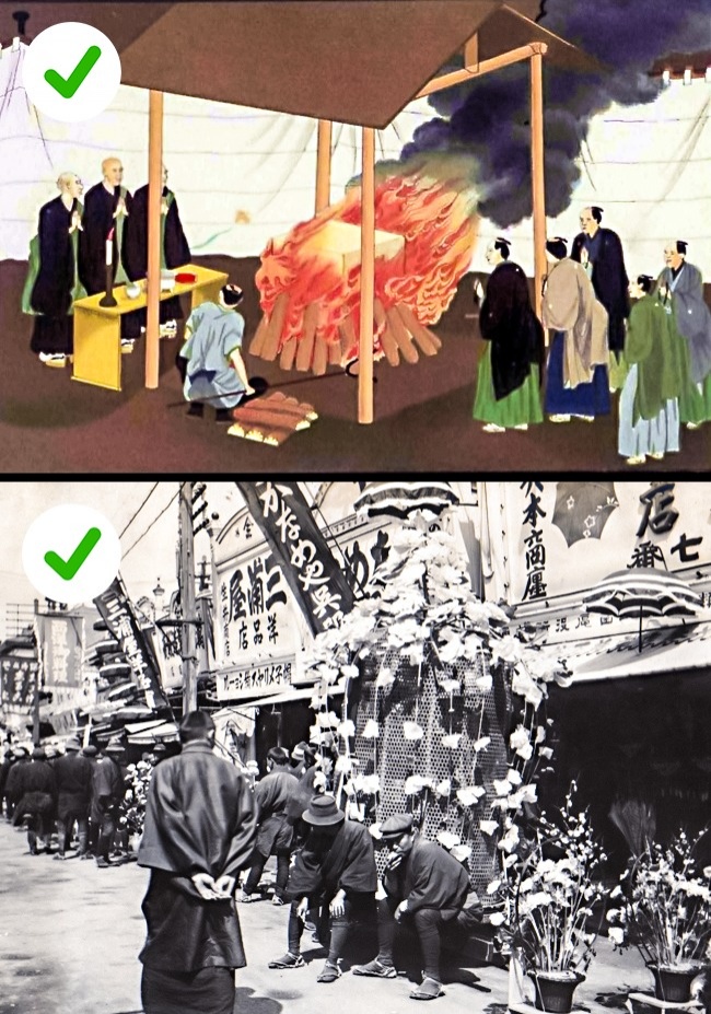Чомусь побутує думка, що в Країні висхідного сонця на похорон одягаються в біле. Насправді в Японії, так само, як і в Європі, колір жалоби — чорний, це видно навіть на гравюрах. На старих фотографіях людей в білому теж немає.