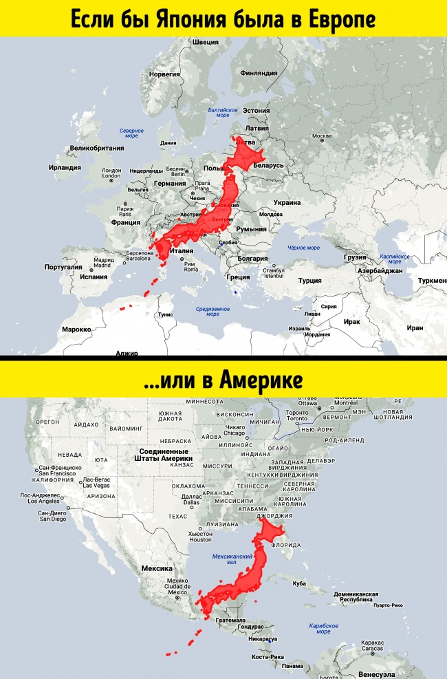 Подивіться, яким гігантом Японія виглядає в Європі і Центральній Америці.