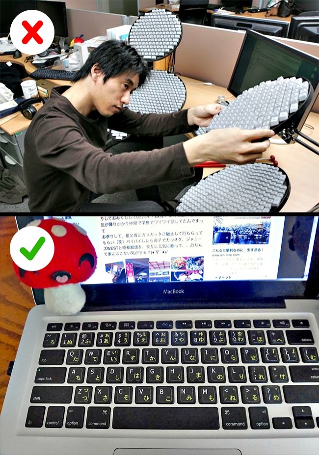Другий варіант — клавіатури як на другому фото вище, на які нанесені символи з абетки хірагана, які теж можуть бути перетворені в ієрогліф (так, хірагана — це ще не ієрогліфи). Цей процес показаний тут. А клавіатура на першому фото зверху — це першоквітневий жарт.