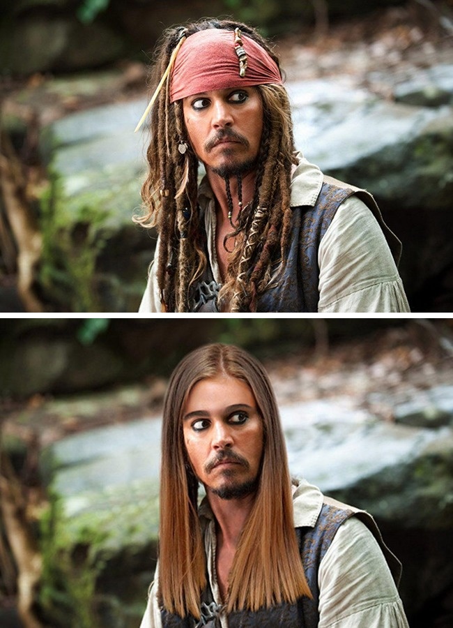 Капітан Джек Горобець завжди виглядає як справжній растаман: дреди з вплетеними фенечками, бандана, кіски з бороди. Ми вирішили надати улюбленому героєві трохи лиску: розчесали і випрямили волосся, а косички зістригли. Вийшло не те щоб захват, але досить весело: схоже, наш пірат в шоці від такої метаморфози.