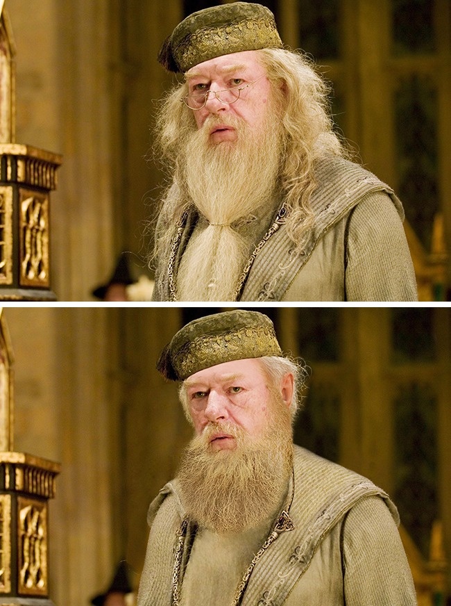 Професор Дамблдор, на відміну від свого давнього приятеля Тома Реддла, до своїм поважним років зберіг густу шевелюру і довжелезну бороду. Ми трохи вкоротили і те і інше, прибрали фірмові окуляри-половинки і... переконалися, що образ Дамблдора був продуманий просто ідеально — зміни йому просто не потрібні.