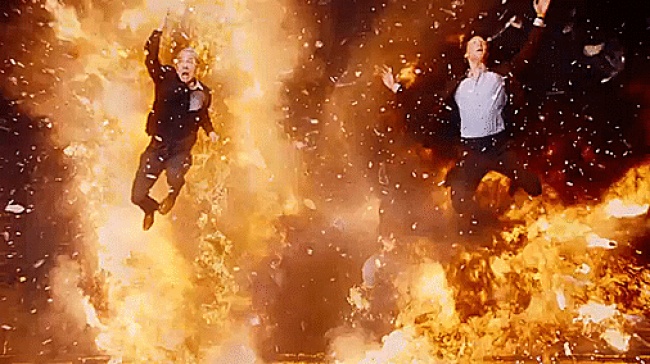 Що відбувається у фільмах: Запасне кліше для героїв фільмів, які не встигли знешкодити бомбу за секунду до вибуху, — спринтерський біг і гарний стрибок, який зазвичай супроводжується зануренням у воду або ефектним приземленням на землю.