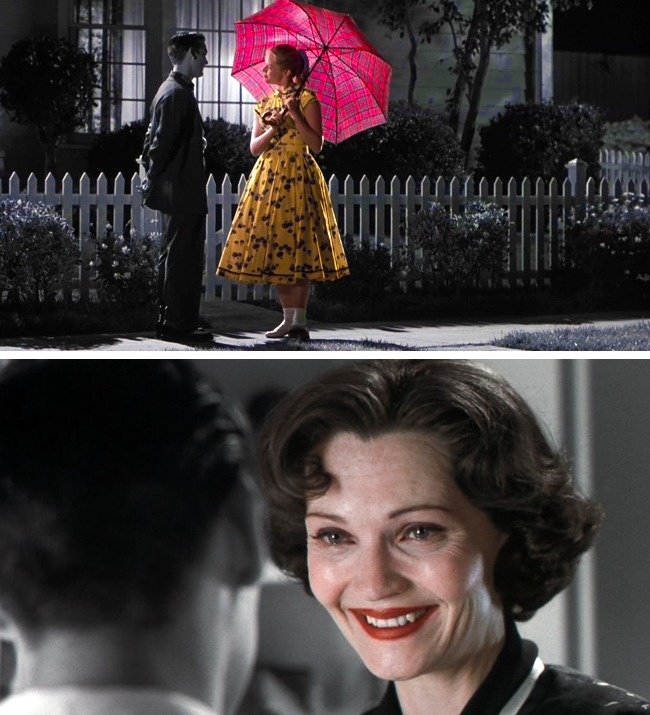 Неймовірно гарний приклад, коли колір бере на себе одну з головних ролей в картині, — це «Плезантвіль». За сюжетом двоє підлітків потрапляють з 90-х у 50-ті роки минулого століття, в чорно-білий світ. Це подорож не обходиться без впливу на місцевих жителів: чим більше пізнають нового герої Плезантвиля, тим більше яскравих фарб з'являється в їхньому житті, а у фільмі з'являються все нові і нові колірні акценти.