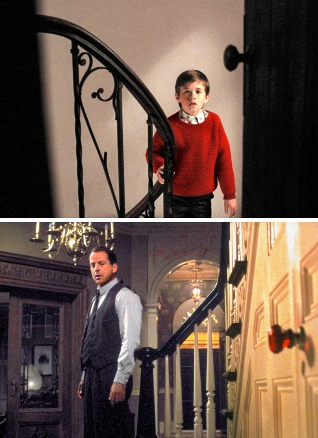 Містичний фільм «Шосте почуття» нагнітає тривожність і постійно відсилає глядача до теми смерті за допомогою червоних предметів, то і справа що зустрічаються в кадрі, будь то светр хлопчика, ручка дверей, повітряна кулька або покривало.