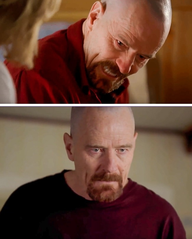 На початку діалогу Уолтер сидить поруч з дружиною в червоній сорочці — хоч він і злиться, але перед нами все ще той самий вчитель хімії. Але потім він починає виходити з себе, знімає сорочку, залишається в темно-бордовою футболці, виголошує свою коронну фразу — і перед нами вже ніби інша людина, набагато впевненіше в собі і куди більш злий.