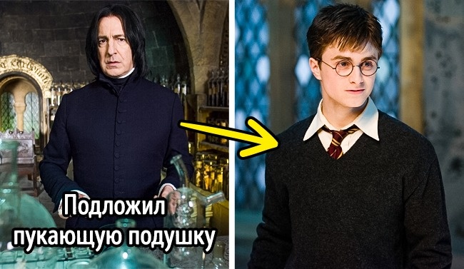Суворий Северус Снейп теж вміє жартувати. Принаймні це міг робити Алан Рікман — актор, який грає даного персонажа в серії фільмів про Гаррі Поттера. От як раз Деніел Редкліфф (Гаррі Поттер) і став жертвою дотепності Алана. У сцені, де всі перебували в головному залі в спальних мішках, він підклав Деніелу пукающую подушку в спальник — ефект був вражаючий.