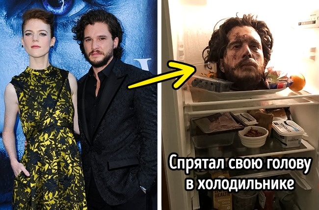 Ох вже ці дивні розіграші. Незрозуміло, про що думав актор Кіт Харінгтон (Джон Сноу в «Грі престолів»), коли вирішив розіграти Роуз Леслі (Ігрітт в «Грі престолів») таким дивним способом. А саме поклав бутафорську голову (точний зліпок своєї, між іншим) в холодильник. Бідна дівчина після такого ледве прийшла в себе.