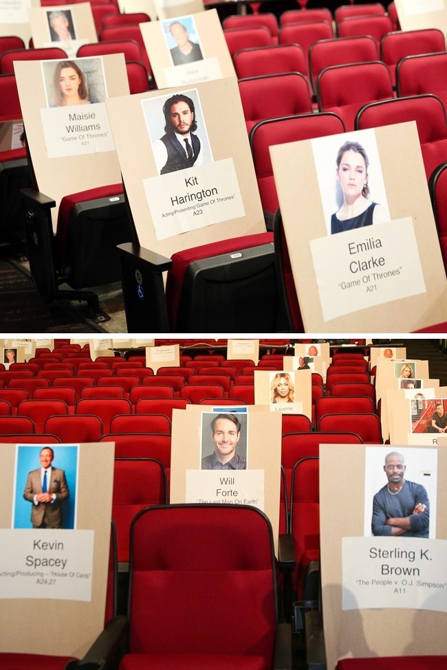 Місця, на яких повинні сидіти знаменитості, бронюють не тільки нудними табличками з іменами, але й цілими портретами. Ймовірно, щоб зірки не заблукали і не переплутали свої місця.