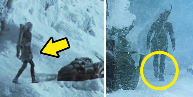 На відміну від інших персонажів, які пробираються через замети, Леголас йде по снігу. Згідно книгам ельфи здатні на це.