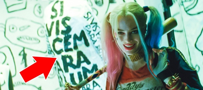 У вітрині, з якої Харлі Квінн дістала собі сумочку, можна побачити манекенів з принтами на одязі. Напис на латині «Si vis pacem, para bellum» (рос. «хочеш миру — готуйся до війни») розкриває одну з головних тем картини.