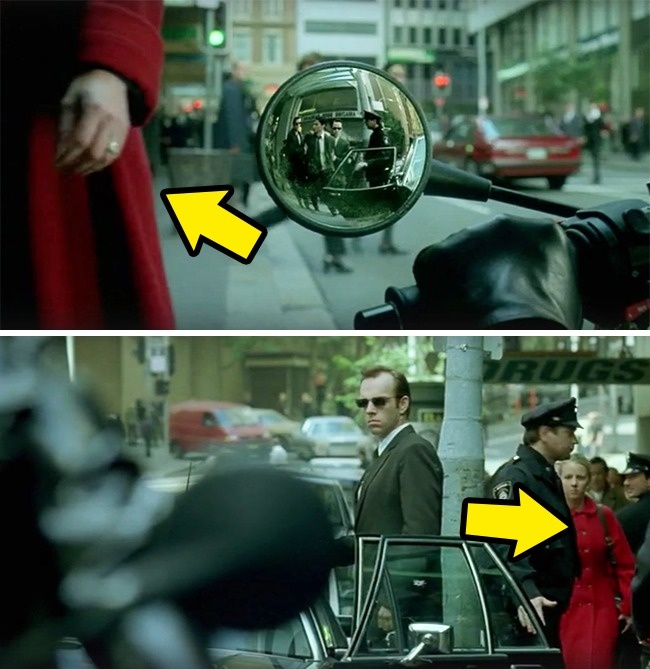 Коли Нео садять в машину, у всіх кадрах присутня жінка в червоному, що дуже символічно. Її герой зустріне і пізніше: під час тренувального процесу він засмотрится на дівчину, не помітивши, що в нього цілиться з пістолета агент Сміт. Жінка в червоному — це частина спеціальної тренувальної програми за ухилення від агентів.