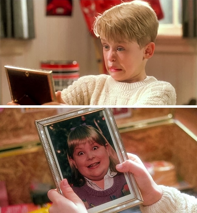 - Дівчину База (старший брат Кевіна) у фільмі «Один вдома» на фото зображує хлопчик у перуці. Режисер вирішив, що дівчинці буде прикро опинитися на цьому місці.