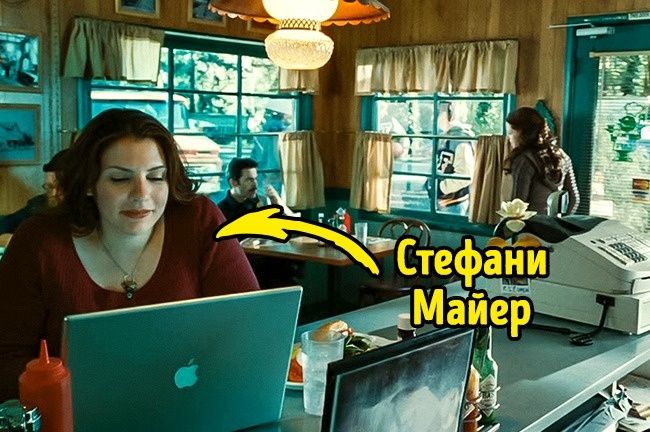 - В епізоді «Сутінків», коли Белла і Чарлі сидять в ресторані, за ними сидить жінка з темним волоссям в червоному светрі і з ноутбуком. Це автор книги — Стефані Майєр.