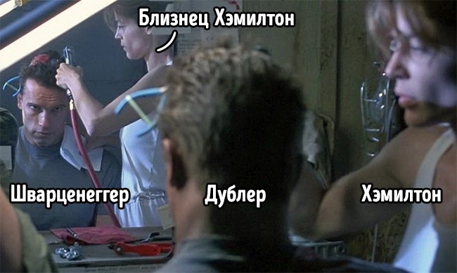 Цікавий спосіб придумав Джеймс Кемерон у своєму другому «Термінаторі». Відображення грали сам Шварценеггер і близнючка Лінди Хемілтон, а персонажів по цей бік — дублер і сама Лінда Хемілтон. Подивіться, ну неможливо ж здогадатися!