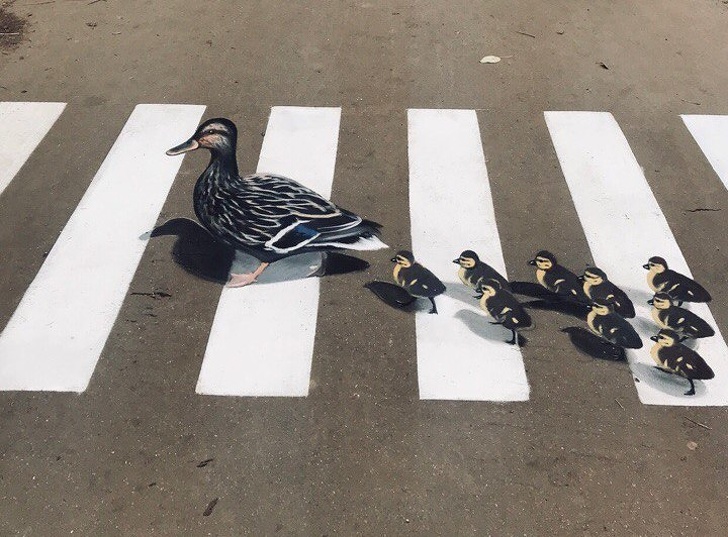 Намальована сім'я качок змушує сповільнити рух біля пішохідного переходу