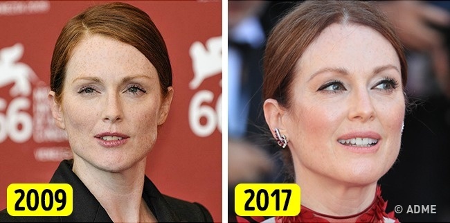 56-річна актриса Джуліанна Мур з роками тільки гарнішає. Секрет її молодості простий — це догляд за собою, спорт і йога. Вона не соромиться свого віку і підтверджує це на численних інтерв'ю: «Так, старію». Втім, це не заважає актрисі виглядати чудово.