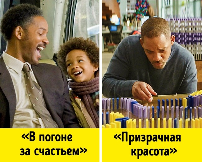 Уілл кожному герою передає частку своєї життєрадісності. Зневірений Говард з «Примарною краси», що кинув виклик небезпеки в «Я — легенда», патологоанатом з «Захисника», батько-одинак з «В гонитві за щастям» і подарував себе людям Бен з «Семи життів» — всі вони зберігають іскру надії. А значить, всі достойні отримають нагороду.