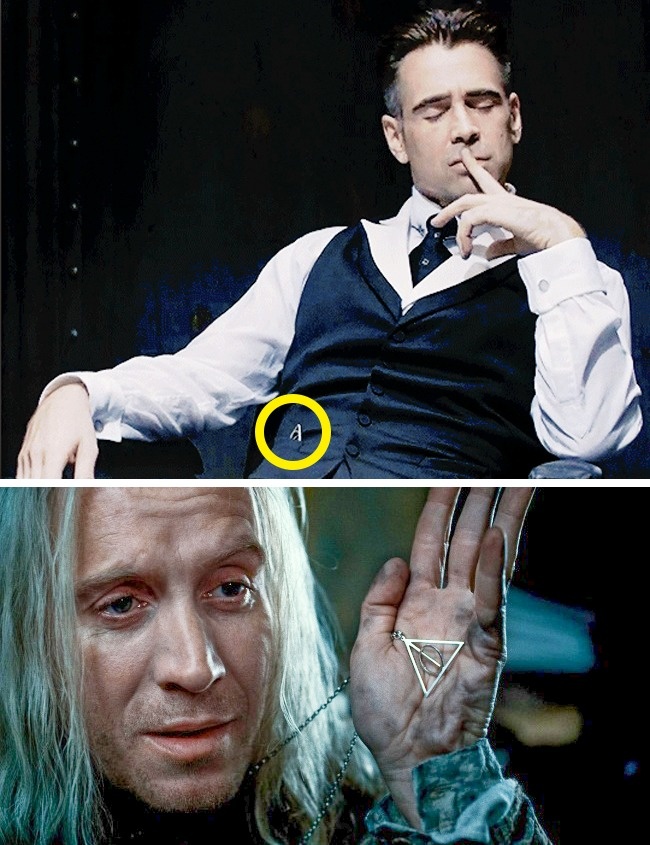 У сцені допиту Ньюта Саламандера (Едді Редмейн) з кишені Персіваля Грейвса (Колін Фаррелл) визирає частина кулона, за формою нагадує Дари смерті — своєрідний натяк глядачам, що перед ними — темний чарівник Гріндевальд. Адже у світі Гаррі Поттера Гріндевальд відомий як небезпечний маг, одержимий ідеєю заволодіти Дарами смерті.