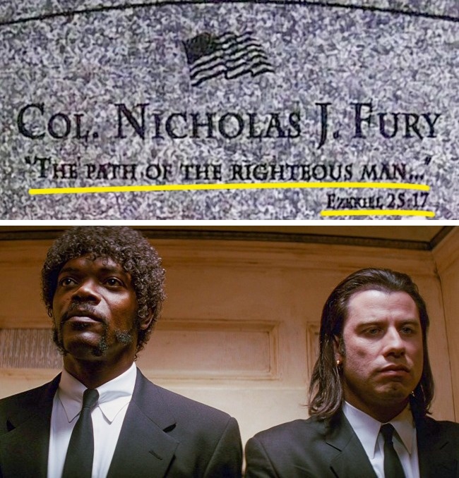 У продовженні «Першого месника» розігрується уявна смерть голови організації «Щ. В. Т.» Ніколаса Ф'юрі. На його могильному камені глядачі бачать цитату з Біблії, виголошену Джулс Уиннфилдом в «Кримінальному чтиві». Чи варто нагадувати, що і Ф'юрі, і Джулс зіграв блискучий Семюел Л. Джексон?