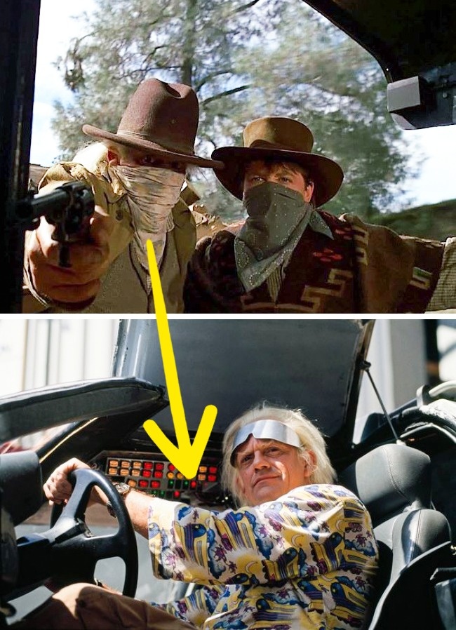 Коли Еммет Браун і Марті носяться по Дикому Заходу, глядачі періодично бачать їх з хустками на обличчі. Якщо придивитися, стане ясно, що Док в якості хустки використовує свою футболку з першої частини трилогії.