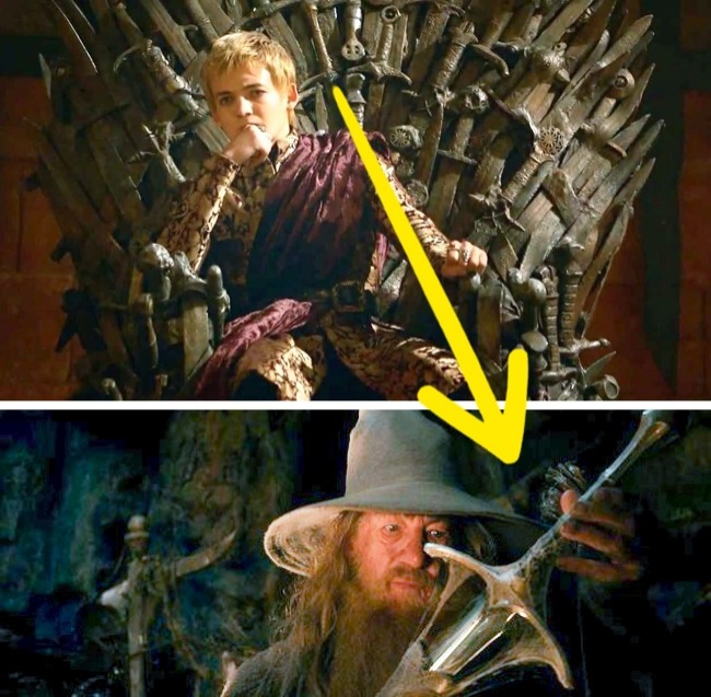 Залізний трон, головний приз в «Грі престолів», заворожує не тільки героїв серіалу. Увагу на нього варто звернути і глядачам. Справа в тому, що деякі клинки, з яких складається трон, зроблені на основі мечів, які «засвітилися» у відомих фільмах. Наприклад, глядачі помітили тут Гламдринг Гендальфа і меч Робіна Гуда з «Робін Гуд, принц злодіїв».