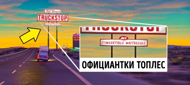 В одному з кадрів глядачі бачать знак з назвою ресторану «Top Down Truckstop», що дослівно можна перекласти як «Без верху: зупинка для вантажівок». На другий, менш прикметною вивісці можна прочитати «All convertible waitresses», тобто «Машини-офіціантки зі знімним дахом». Дорослим глядачам було нескладно провести аналогію зі світом людей.
