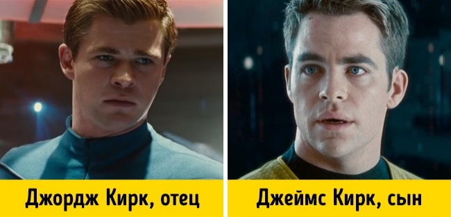На самому початку фільму «Зоряний шлях» (2009 рік) ми за досить трагічних обставин знайомимося з капітаном Джорджем Кірком, роль якого виконав Кріс Хемсворт. А потім ми дізнаємося і його сина — бравого Джеймса Кирка (Кріс Пайн), чия схожість з батьком відзначають всі члени зоряній академії, колись його знали.
