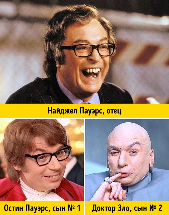 В останній частині кіноісторії про нескінченно привабливого шпигуна світового масштабу «Остін Пауерс: Голдмембер» глядач дізнається про несподіваних родинних зв'язках між героями. Виявляється, серцеїд і шпигун Найджел Пауерс (Майкл Кейн) доводиться батьком не тільки Остіну Пауерсу (Майк Майерс), але і його заклятому ворогові Доктор Зло, якого також зіграв Майк Майерс.