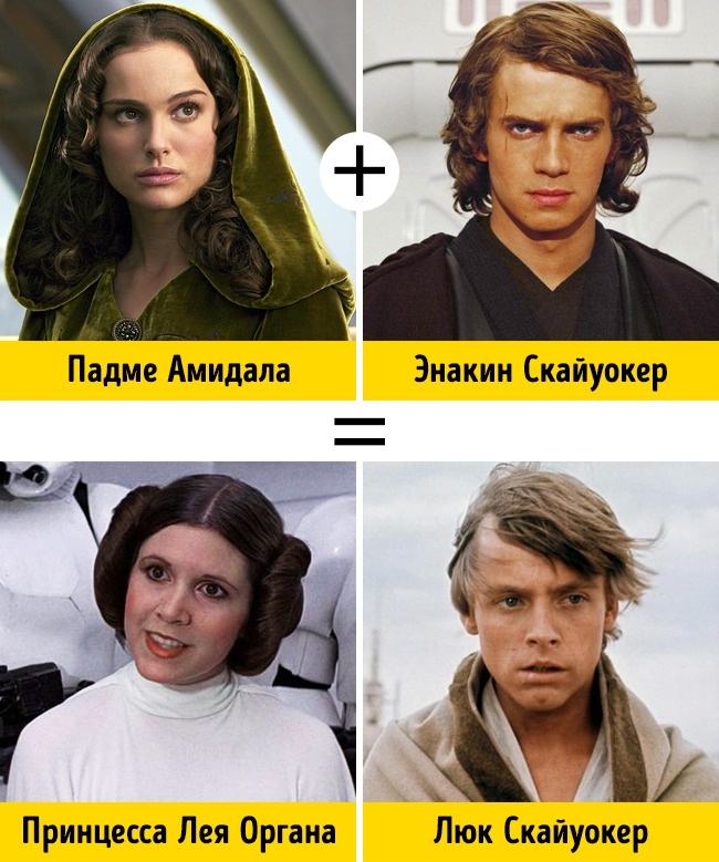 Одна з найтриваліших і культових кіношних саг може похвалитися солідним генеалогічним древом. Прекрасна Падме Амідала (Наталі Портман) народила двох дітей від джедая Енакіна Скайуокера (Хейден Крістенсен) — Лею Органу (Керрі Фішер) і Люка Скайуокера (Марк Хемілл).