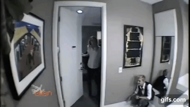 Одна з найстаріших і банальних жартів — зачаїтися за кутом і налякати нічого не підозрює одного. Так сталося і зі співачкою Тейлор Свіфт, яку своїм криком жахнула американська телеведуча Еллен Дедженерес. Від несподіванки Тейлор навіть вдарилася об стіну.