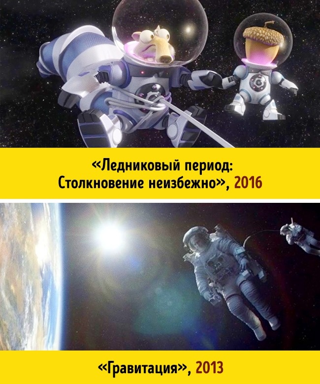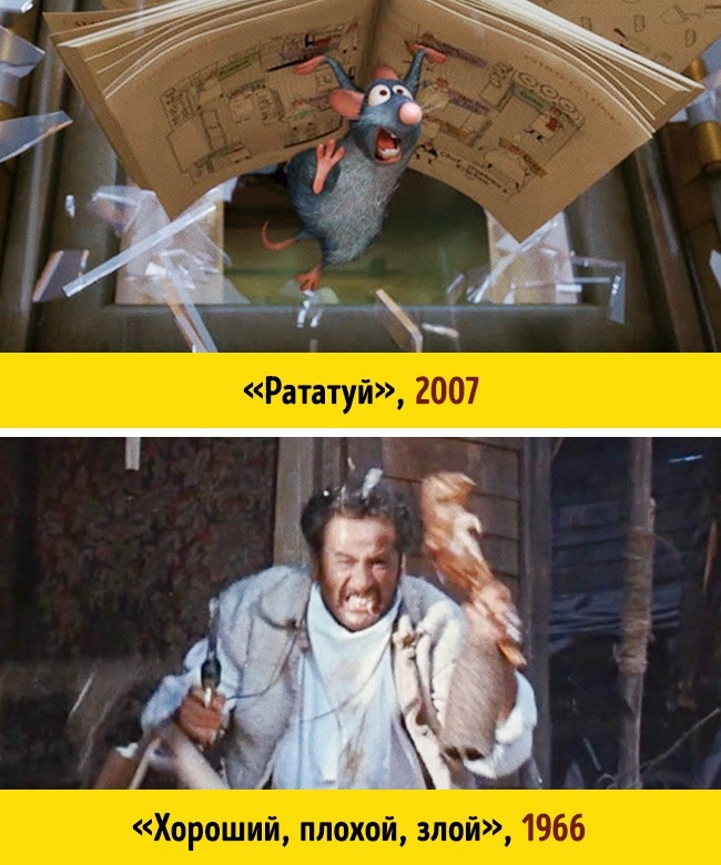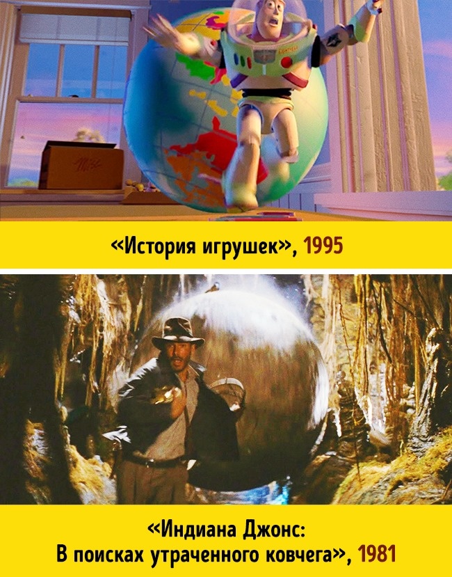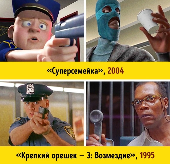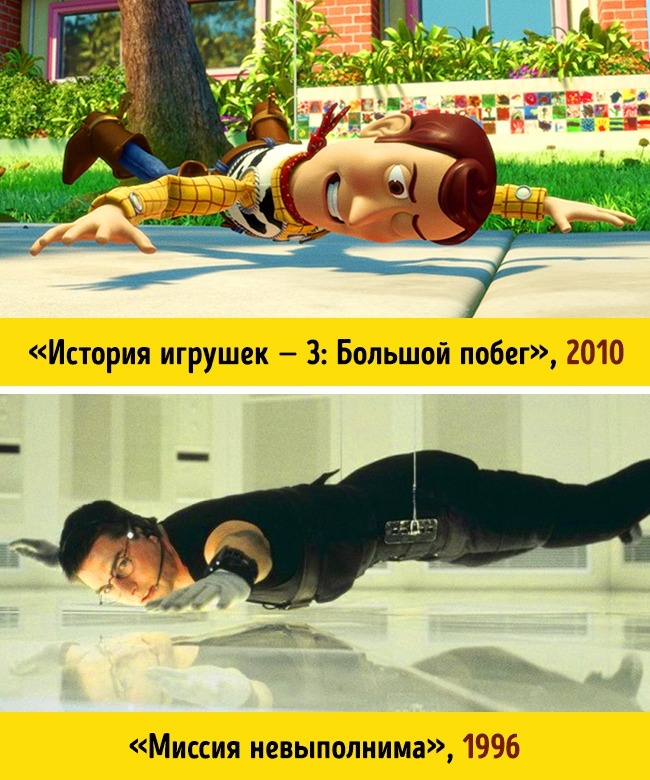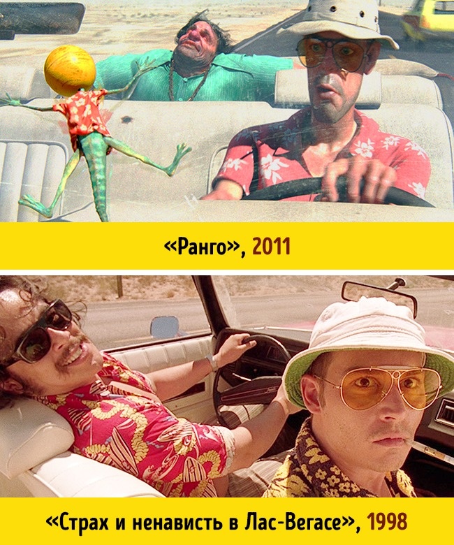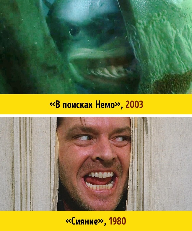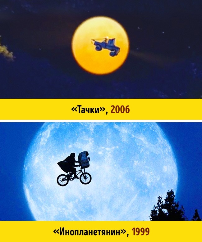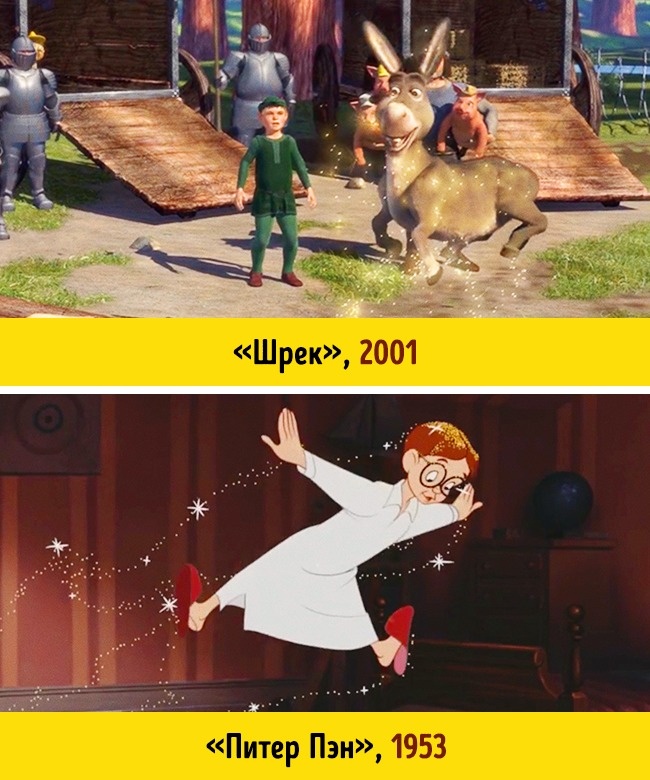 Мабуть, мультфільми про Шрека займають перше місце за кількістю посилань і пародій на різні казки і голлівудські фільми. Наприклад, та сцена, де осел, оповитий золотим сяйвом, отримав здатність літати, була взята з класичного мультфільму «Пітер Пен».