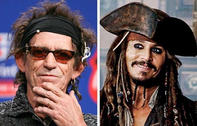 Виконуючи відому роль у фільмах серії «Пірати Карибського моря», Депп намагався наслідувати ході, жестах і манерам Кіта Річардса — знаменитого гітариста The Rolling Stones. Звідти ж інші риси — любов до фенечкам, банданах і кілець. Не вірите? У третьої частини франшизи на прохання Деппа Річардс зіграв батька Джека Горобця (капітана Тіга). Звідси і феноменальне схожість батька і сина на екрані.