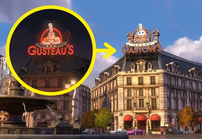 На задньому плані видніється будівля ресторану, в якому розгортаються дії мультфільму про крысенке-кулинаре. Та це ж будинок ми можемо побачити в місті, де мешкають машини.