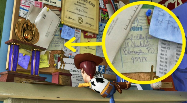 Disney не включила цей секрет свого відео, але тим неї менше глядачі помітили, що на дошці у хлопчика Енді з «Історії іграшок» прибито лист від Карла і Еллі Фредріксен, героїв мультфільму «Вгору».