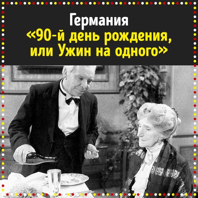 «90-й день народження, або Вечеря на одного» — це справжнє телепристрастие німців. Стрічка була включена в Книгу рекордів Гіннеса як найбільш повторюваний фільм — його показували більше 3300 разів. Респектабельна дама відзначає ювілей і виходить до своїм дорогим гостям. Тільки ось невдача: усі її друзі давно померли. Тому лакей Джеймс намагається порадувати міс Софі і створити ілюзію присутності її друзів. Завдяки збільшенню кількості алкоголю, спожитого вірним лакеєм, кожна нова подача страв стає смішніше попередньої.