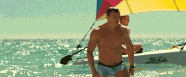 Під час зйомок Деніел Крейг просто звалився у воду, але зйомку з якоїсь причини не припинили, в результаті вийшла неймовірно сексуальна і найвпізнаваніша сцена всієї бондіани. До речі, ці плавки стали хітом і були продані на аукціоні в Лондоні за $ 72 000.