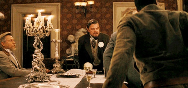 За сценарієм Дікапріо мав голосно декламувати і розмахувати руками. Але актор в пориві почуттів вдарив по столу і порізав об скло руку. Тарантіно не зупинив зйомку, як і Дікапріо не припинив гру, від чого сцена вийшла моторошної і запам'ятовується. Доказ того, що Лео дійсно заслужив свій «Оскар».