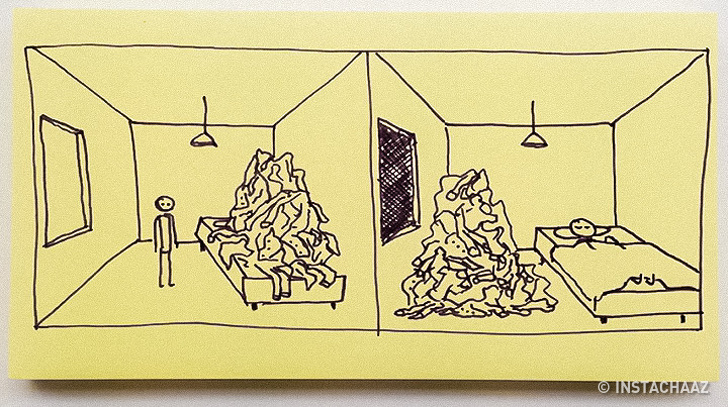 Художник Чаз Хаттон (Chaz Hutton) може підняти настрій кожному, виклавши будь-яку життєву ситуацію на звичайному жовтому стікері. Він чудово уловлює знайомі всім моменти з життя і відтворює їх на маленьких аркушах у вигляді простих і кумедних коміксів.