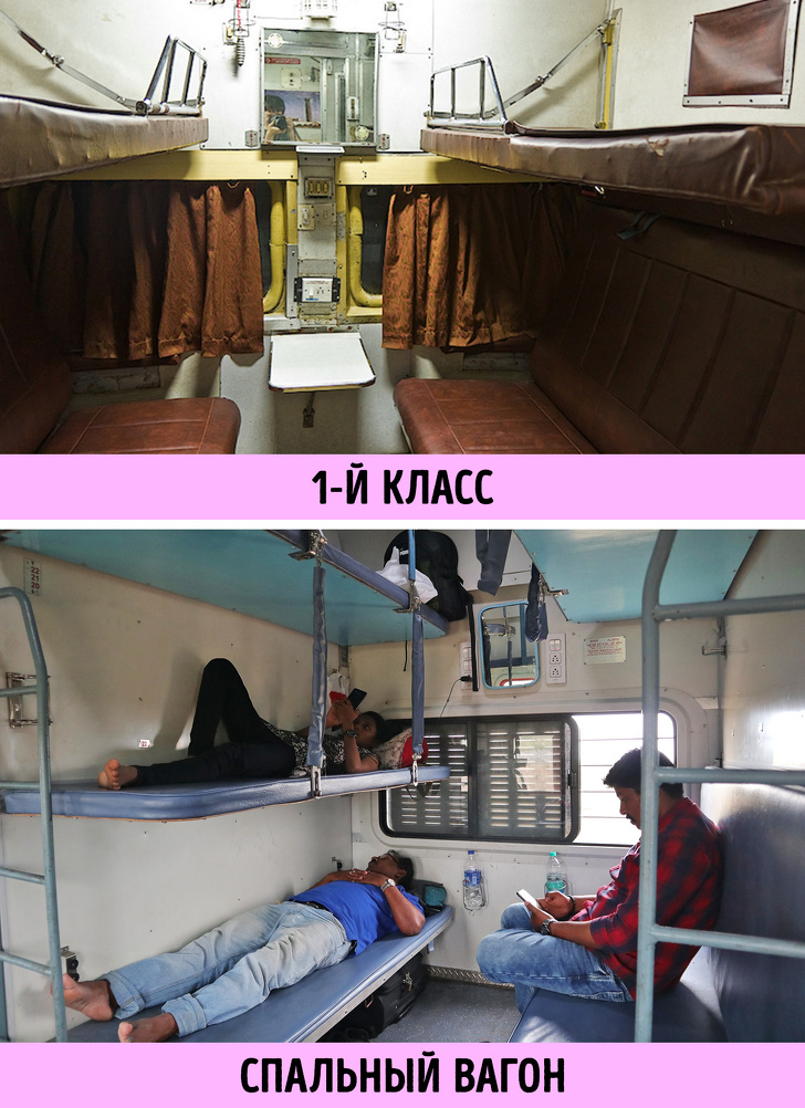 Найвищий клас — 1-й з кондиціонером — виглядає як наше стандартне купе. Такі вагони бувають не в кожному поїзді. Аналога СВ в індійських поїздах взагалі немає. Класом нижче — вагони типу нашого плацкартного, тільки зі шторками, якими відокремлюються купе і бічні місця. Самий популярний тип вагонів називається Sleeper, він розрахований на 72 пасажира. Там 6 полиць в купе замість 4. Середні полиці відкидаються тільки на ніч. Кондиціонер в таких вагонах не передбачений, так як вони не засклені. Є розхожа думка, що людина, яка не проїхався на індійському поїзді, вважай, і не був в Індії.