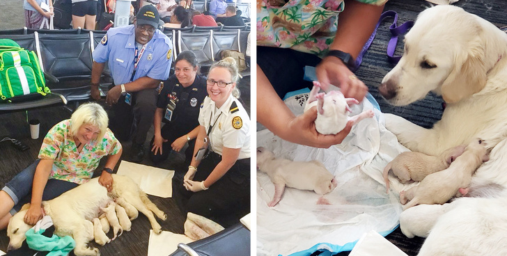 - В аеропорту американського міста Тампа раптово почала народжувати собака-поводир Еллі, що виявилося повною несподіванкою для її господині. На допомогу Еллі прийшла бригада швидкої допомоги та пожежний, який чергував в аеропорту. Собаку вирішили нікуди не переносити, та 8 цуценят народилися на очах у натовпу глядачів, які знімали все на телефони. За законом цуценятам можна літати тільки з 8-тижневого віку, але для собачого сімейства зробили виняток, і молода мама з господинею і потомством вирушила далі, в Філадельфію. © TomPodolec / Twitter